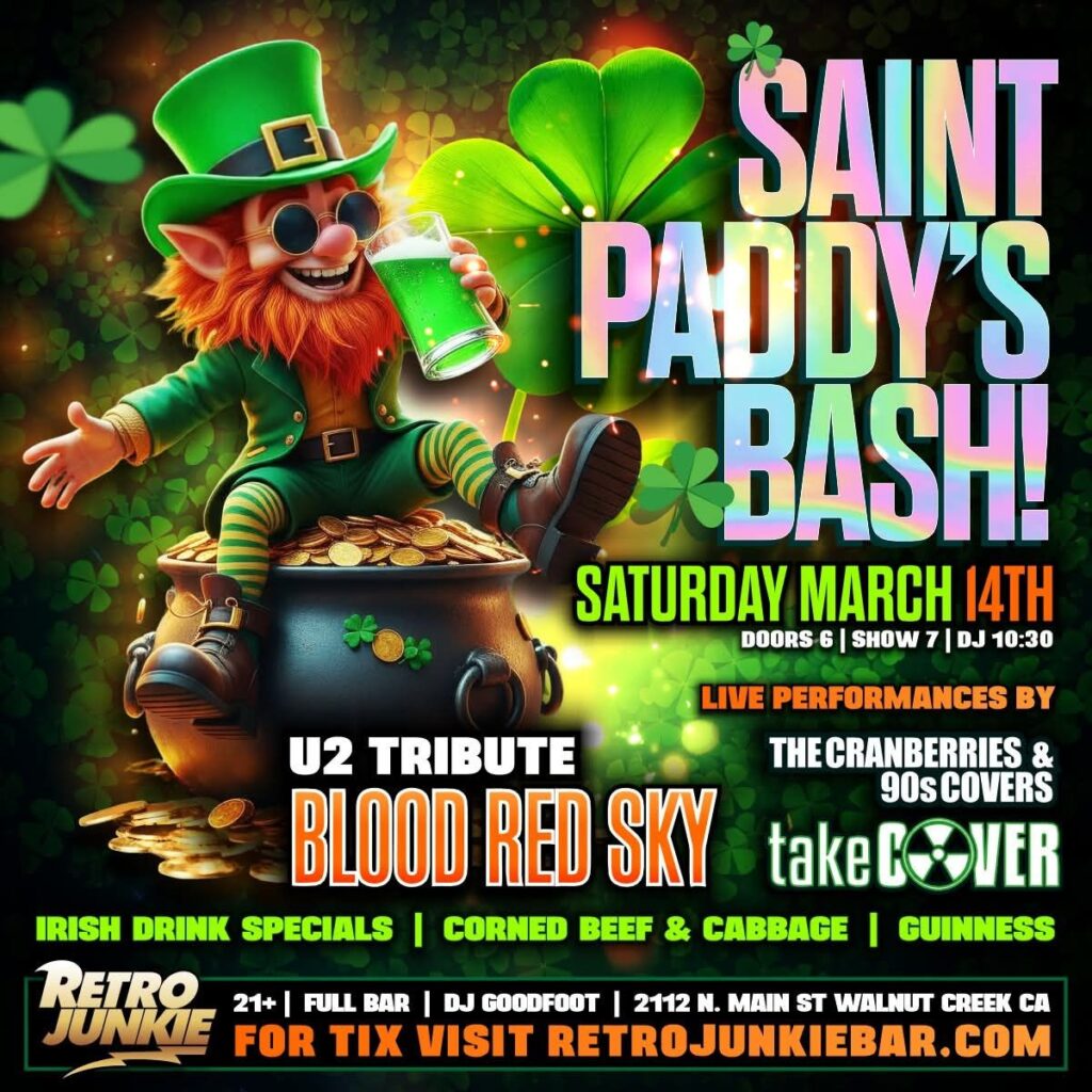 It’s Retro Junkie’s Saint Patrick’s Day Bash featuring Blood Red Sky (A Tribute to U2) with Take Cover (A Tribute to The Cranberries + 80s/90s rock covers) and DJ DARKERDAYS (80s-00s Party Jams)!